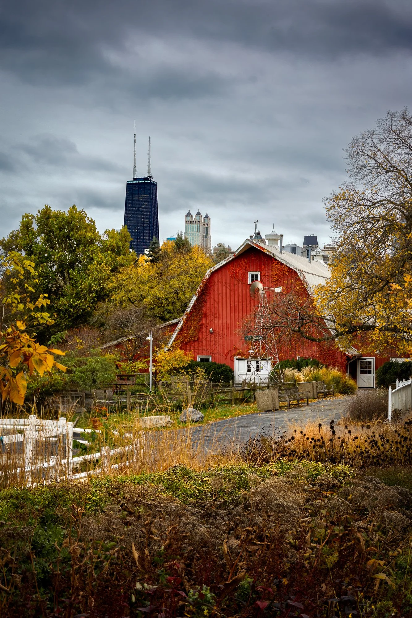 This is the Farm-in-the-Zoo, an interactive exhibit nestled within the Lincoln Park Zoo. Opened in 1964 and renovated in 2002, the farm was designed to introduce city dwellers to domestic farm animals and agricultural life. It is a charming space, but its most striking feature is its location. The rustic red barn is surrounded by trees displaying brilliant shades of yellow and gold. It looks like a scene pulled straight from the rural Midwest. Yet, rising immediately behind the barn, piercing the overcast gray sky, is the unmistakable black steel of the John Hancock Center. It is a rare place where you can experience two entirely different worlds in a single glance.
