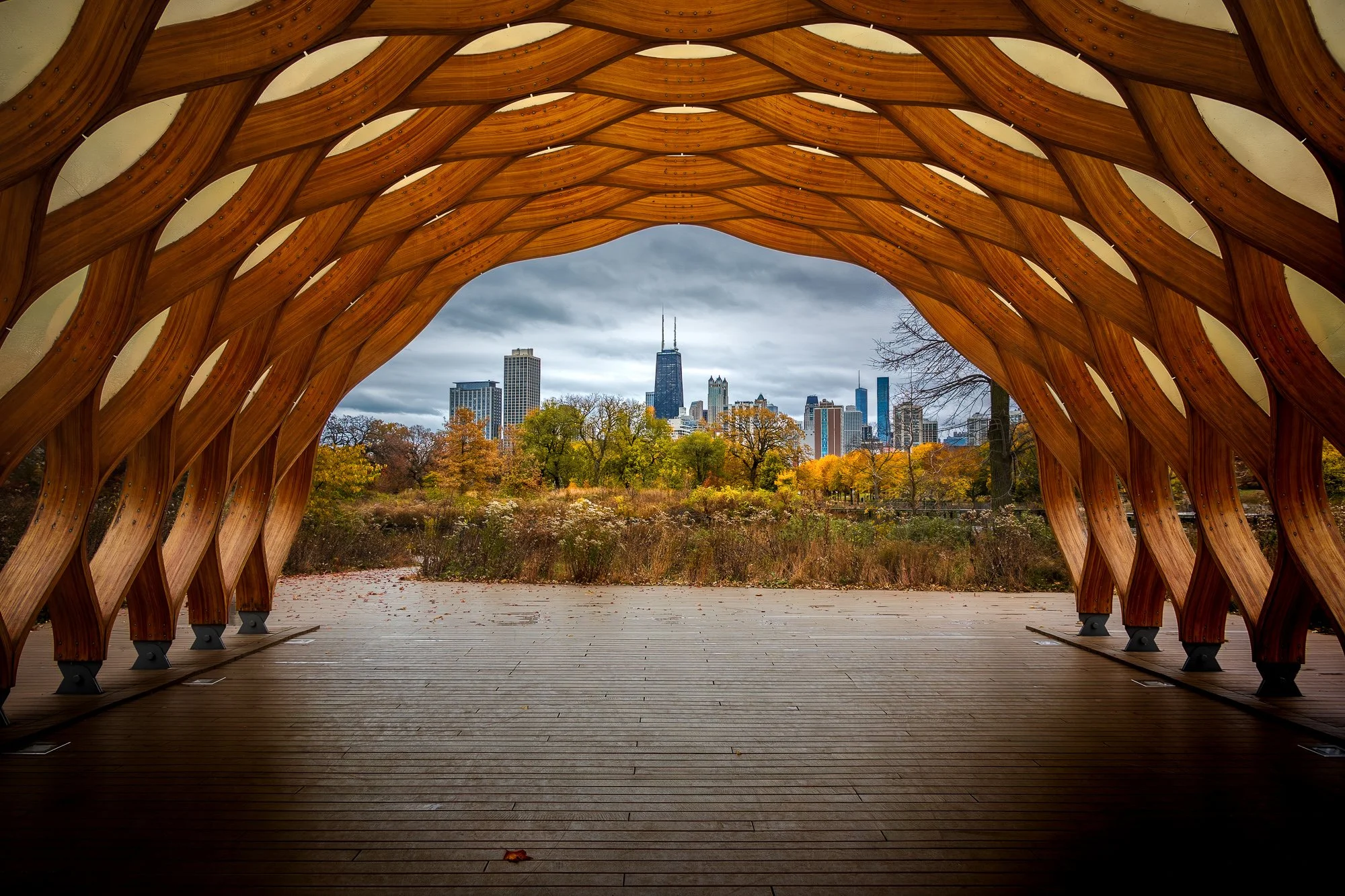 The pavilion doesn't just sit in the park; it actively engages with it. By framing the rigid, vertical scale of the city through an organic, wooden lens, the pavilion highlights the delicate balance Chicago maintains between its towering architecture and its sprawling natural spaces.
